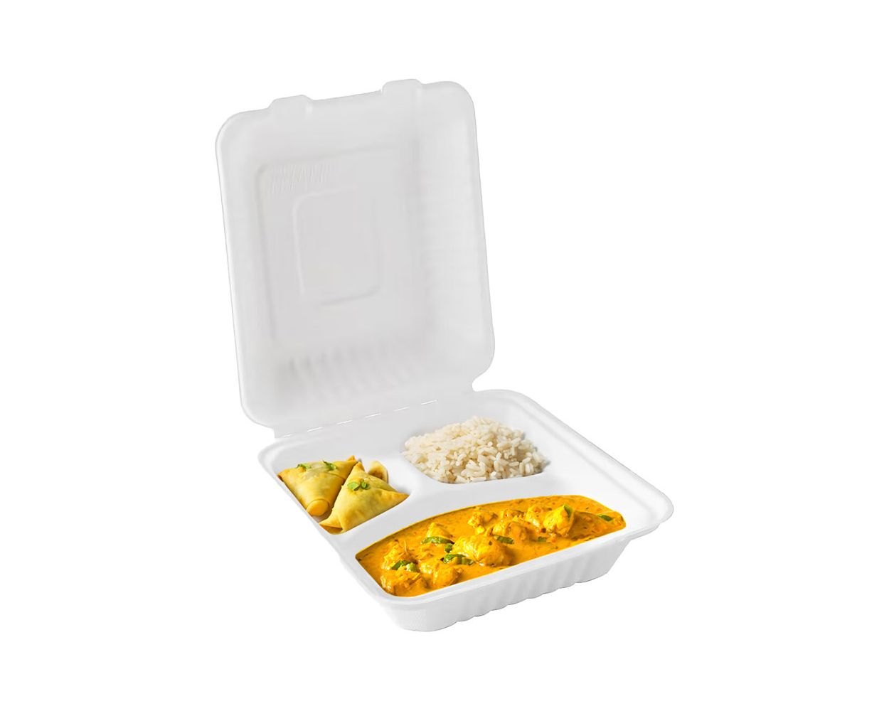 These hinged food boxes are manufactured from 100% sugarcane fibre and can be used in cold cabinets as well as microwaves.