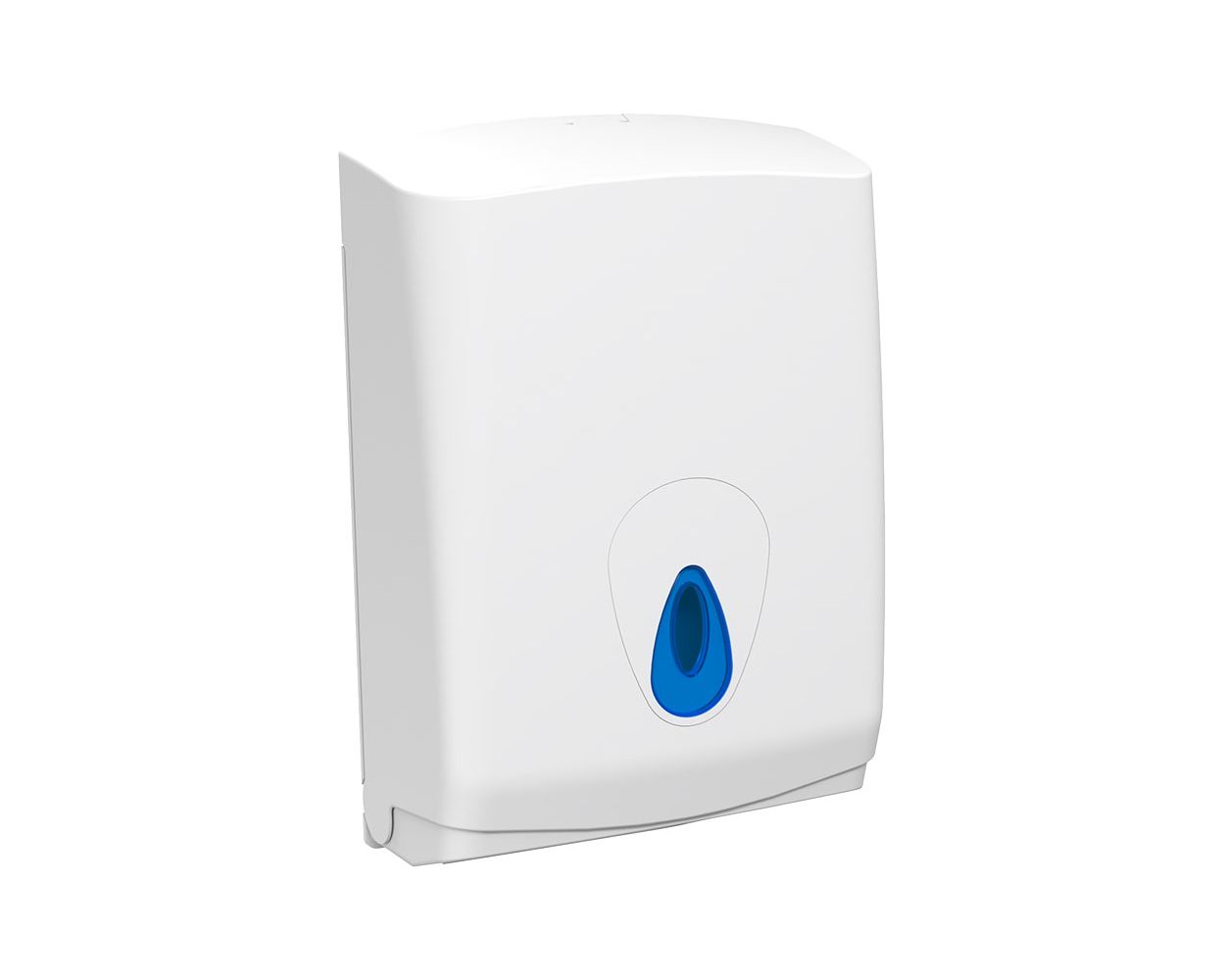 This sleek large folded hand towel dispenser in classic white combines versatility with practical design. Built with adaptability in mind, it accommodates a wide variety of hand towels and can even serve as a convenient dispenser for face coverings, making it a truly multipurpose solution for any facility.