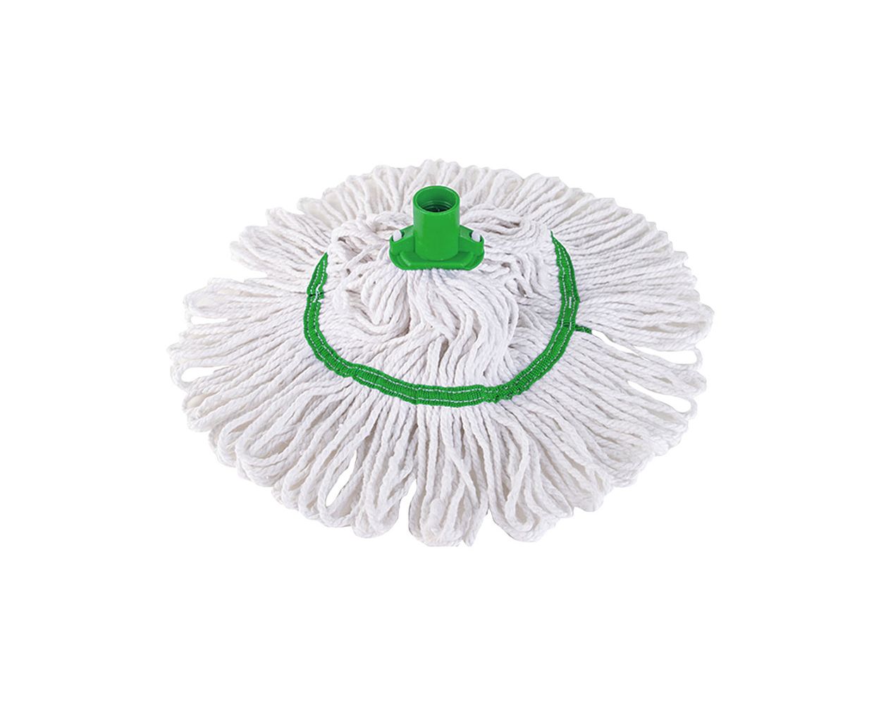 A circular mop head with a T1 screw thread socket. The stayflat band holds the circular shape enabling the mop to cover a larger floor area, whilst the looped end yarn prevents linting and the yarn tangling in use. Made from a unique blend of polyester and cotton yarns for improved strength and absorbency.