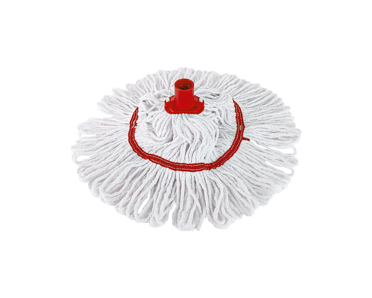 A circular mop head with a T1 screw thread socket. The stayflat band holds the circular shape enabling the mop to cover a larger floor area, whilst the looped end yarn prevents linting and the yarn tangling in use. Made from a unique blend of polyester and cotton yarns for improved strength and absorbency.