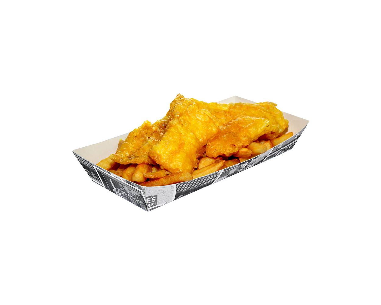 This Newsprint Extra Large Open Tray is part of our hot food to go range. It can be used for many kinds of fast food meals, for example grilled chicken, fish or sausage with fries. It features a trendy newsprint design which is very traditional in fish and chip take away.