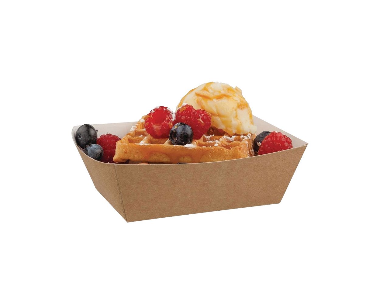 This paperboard tray is suitable for many different kinds of snacks and finger foods such as burgers, French fries, chicken nuggets, nachos, potato wedges, etc. In addition its simple product presentation, this tray is an ideal container for instant eat.