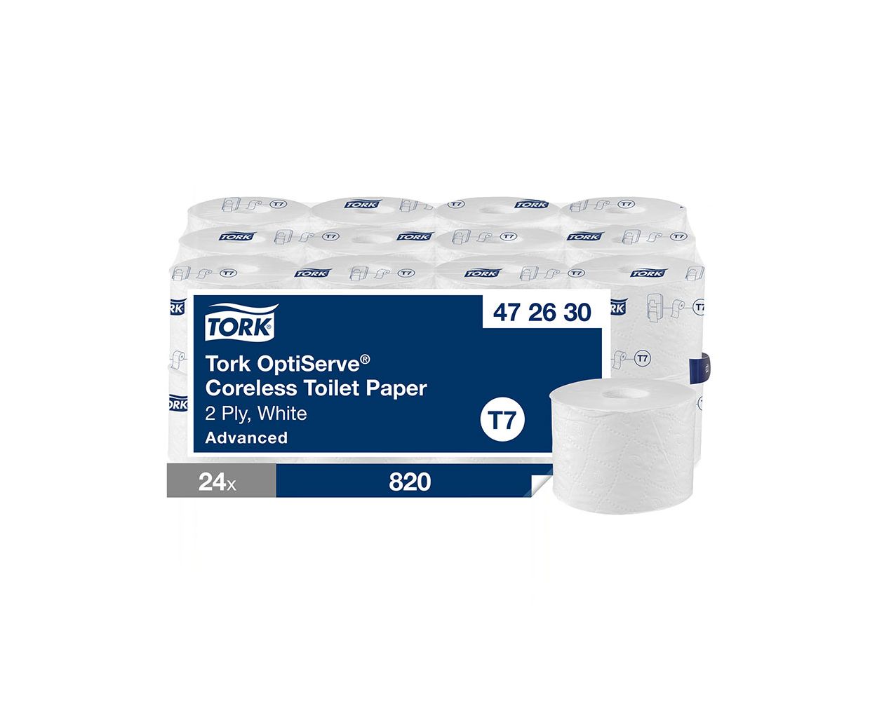 Tork OptiServe® Coreless Toilet Paper White T7: Tork OptiServe® Coreless is a high-capacity coreless toilet paper system for facilities where efficiency, sustainability and providing a great experience are key. High capacity, reduced storage space, and certified easy to use dispensers make it a better alternative to conventional toilet paper and jumbo rolls. These 2-ply tubeless toilet paper rolls fit a wide range of compatible coreless toilet paper dispensers to meet different washroom needs, so the same compact toilet roll refills can be used across the facility. Compared to conventional toilet paper, Tork OptiServe® coreless rolls hold 3x more paper, with no core and no wrap for less waste.