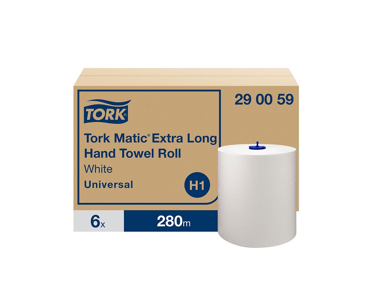 Tork Matic® Extra Long Paper Hand Towels White H1: Stay on budget while providing an efficient hand-drying experience with our Tork Matic® Extra Long Paper Hand Towels. The extra long roll lasts longer, meaning fewer refills are required which saves maintenance time. This roll is designed to balance cost and performance. Reduce waste and boost hygiene in the likes of busy schools and manufacturing washrooms by placing these paper hand towels in a Tork dispenser that offers one-at-a-time dispensing.